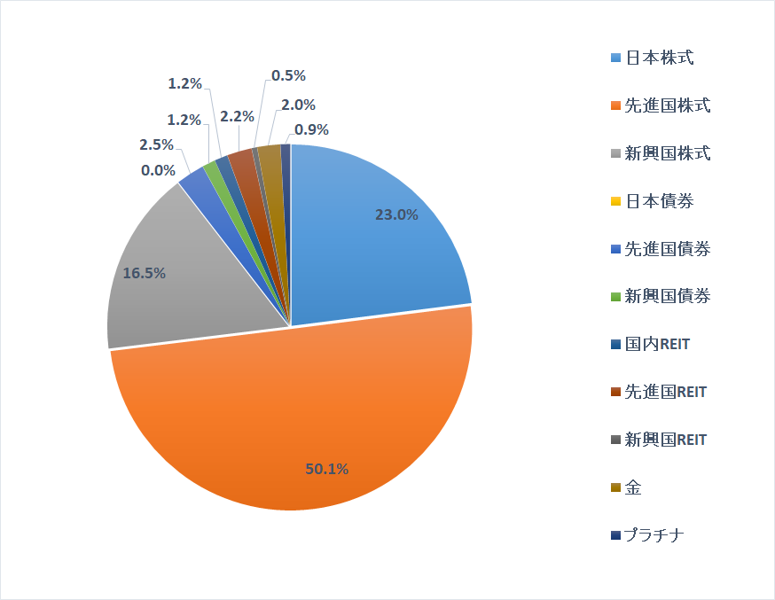 先月と比較すると、日本株0.6%増、先進国株0.5%減、新興国株0.2%増、日本債券増減なし、外国債券0.1%増、REIT0.1%減、ゴールド・プラチナ増減なしとなりました。