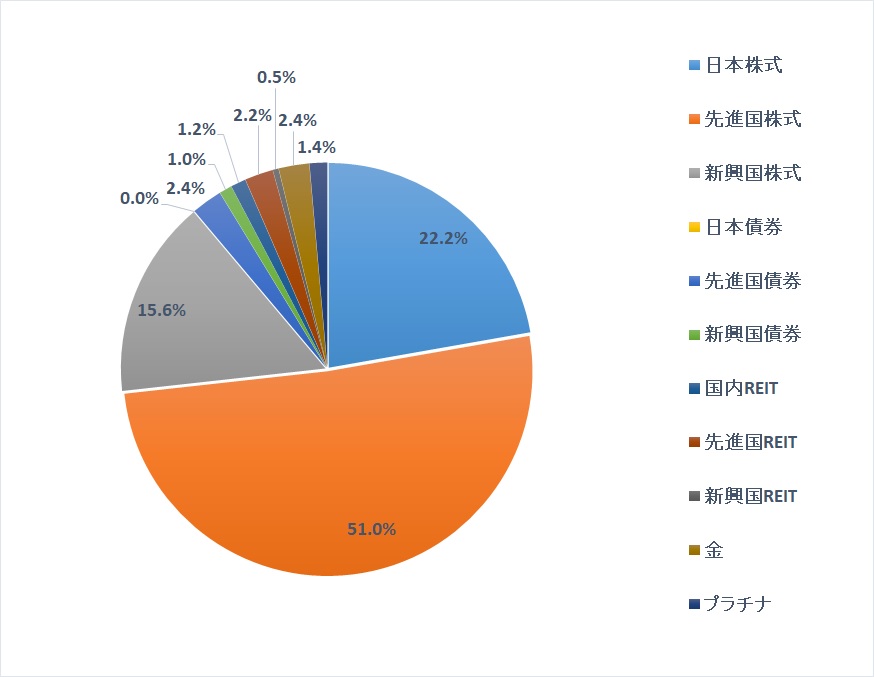 先月と比較すると、日本株0.7%減、先進国株0.8%増、新興国株0.5%減、日本債券増減なし、外国債券0.4%減、REIT0.1%減、ゴールド・プラチナ0.7%増となりました。